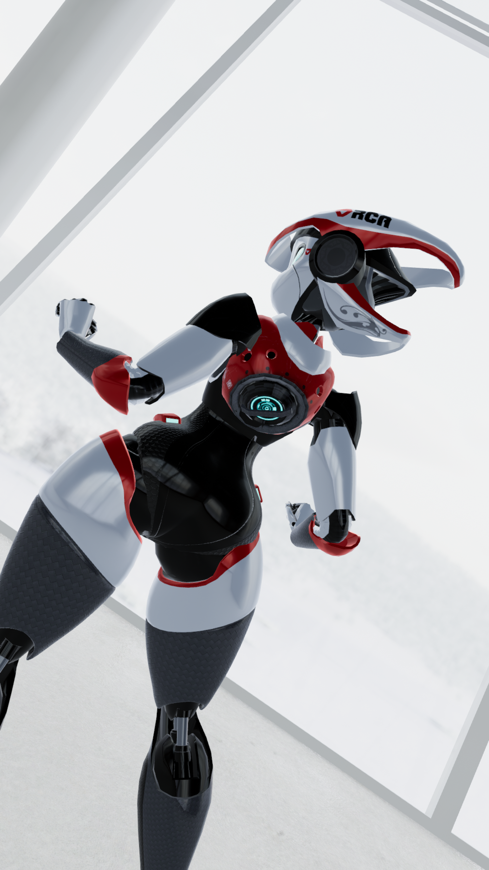'Kalia' robot avatar for VRChat, full body compatible, Full Unity package, ▲ 27,210 , Includes body shape slider, animated power core recharger and interactive pysbones in halo.